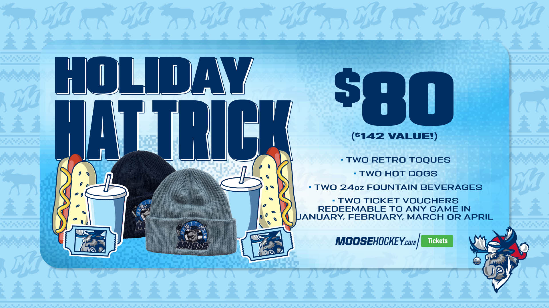 .Get two (2) ticket vouchers redeemable to any home game in January, February, March or April, two (2) Manitoba Moose retro toques and two (2) hot dogs, two (2) 24oz fountain beverages