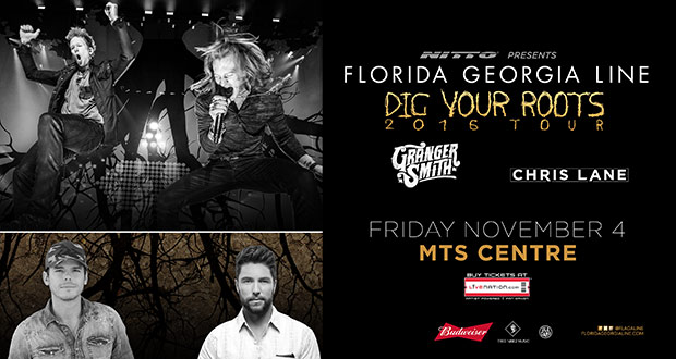 Florida Georgia Line Published: September 7, 2016 Event DetailsDateNovember 4, 2016 7:00 pmVenueMTS CentreBUY NOWhttp://www.ticketmaster.ca/florida-georgia-line-dig-your-roots-winnipeg-manitoba-11-04-2016/event/1100511FBC72E15C?artistid=1580115&majorcatid=10001&minorcatid=2DIG YOUR ROOTS TOUR FLORIDA GEORGIA LINE PRESENTED BY NITTO WITH SPECIAL GUEST GRANGER SMITH CHRIS LANE NOVEMBER 4TH MTS CENTRE WINNIPEG, MB