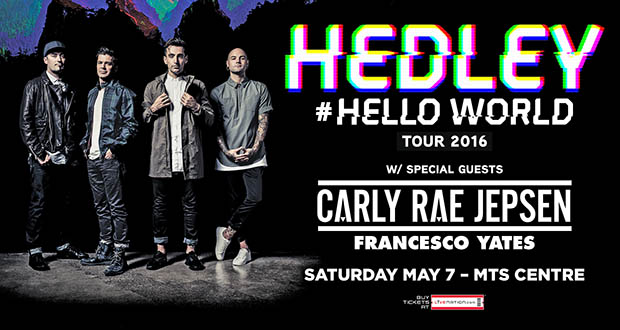 Juno Award winners and multiplatinum chart-toppers Hedley announce their coast-to-coast 2016 Canadian arena tour in support of their sixth studio album, Hello. Joining Hedley on the 28 dates across the country will be very special guest Carly Rae Jepsen, and Francesco Yates. Tickets will go on sale in all markets on Friday, November 6. Complete tour listing below, and local on sale times are listed here. Check the band’s website October 30 for presale details.