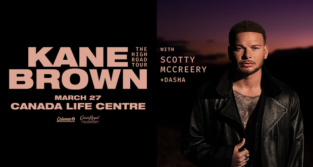 Kane Brown Published: October 10, 2024 BUY TICKETSBuy TicketsDateMarch 27, 2025Start time7:00 pm Kane Brown is bringing The High Road Tour with Scotty McCreery and Dasha to Canada Life Centre on March 27, 2025. Tickets are on sale to public on Friday, Oct. 18 at 10am!