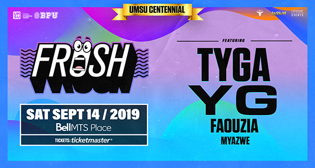 Umsu Frosh Centennial W/ Tyga, YG, Faouzia, Myazwe Published: September 3, 2019 UMSU CENTENNIAL FROSH FEATURING… TYGA YG FAOUZIA MYAZWE SATURDAY, SEPTEMBER 14, 2019 Canada Life Centre Doors: 6 PM